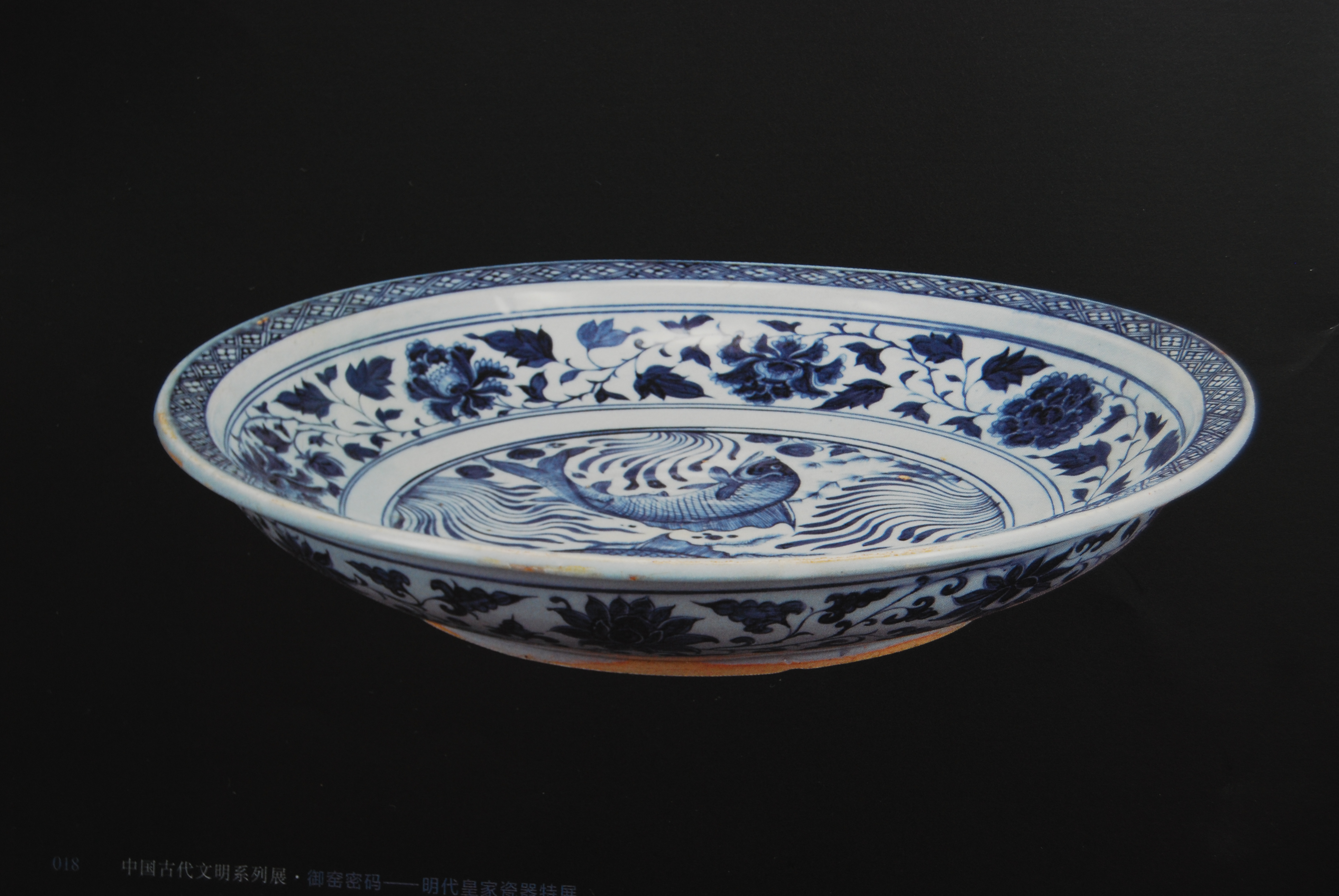 青花色彩艳丽而明快,从盘沿至盘心的纹饰分为三组:盘心绘有鲢鱼和鲫鱼各一条,嬉游于水藻中,画面动感强烈;盘口沿绘变形织锦纹一周;盘内壁饰缠枝牡丹花七朵。盘外壁一周绘缠枝莲八朵,均为辅助性装饰的纹饰。 纹鱼藻纹是元代瓷器上流行的纹样,采用传统的对称分布的格局形式予以表现,画面线条生动流畅,就好像一副充满了生活情趣的水墨画。 牡丹纹也是元代瓷器上常见的纹样,其画风相对比较固定。 从纹饰上分析,此盘上的双鱼牡丹纹显然属景德镇官窑画师通常使用的比较流畅的纹样,花叶较肥硕,且为尖瓣形,花朵不填满色而留,因此,此件青花双鱼牡丹纹瓷盘属元代景德镇官窑的代表性产品。